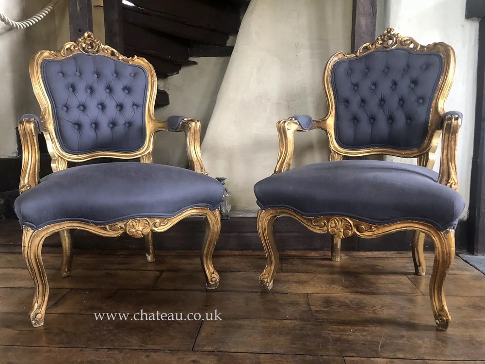 SOLD - Pair of Gilt Antique French Louis XV Fauteuil Gold Blue Grey Armchairs c1800's , Chairs & Seating ,