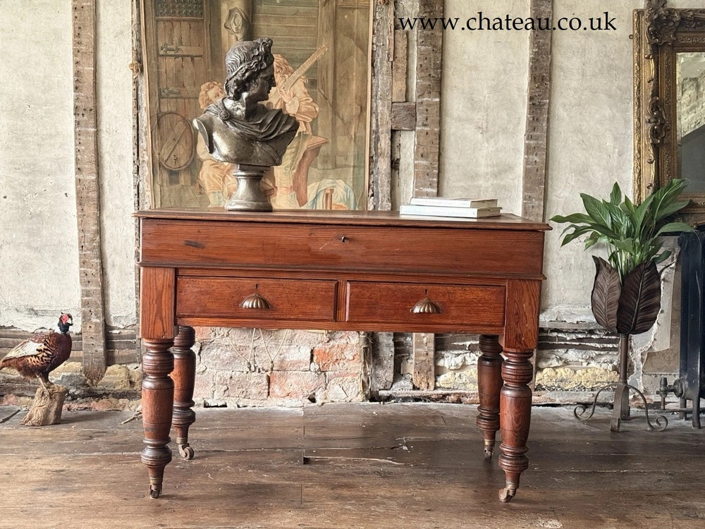 This substantial school desk has a lift-up top over a pair of drawers, supported by solid, turned supports, retaining its original castors.