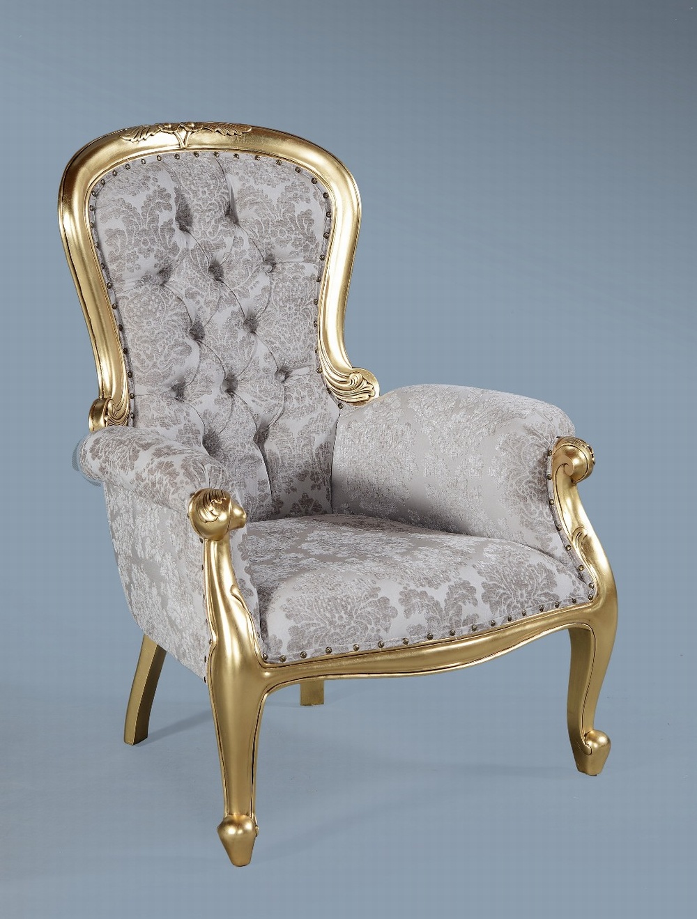 This stunning chair has a contemporary twist by being gilded in a glamorous finish of gold leaf.<br>
